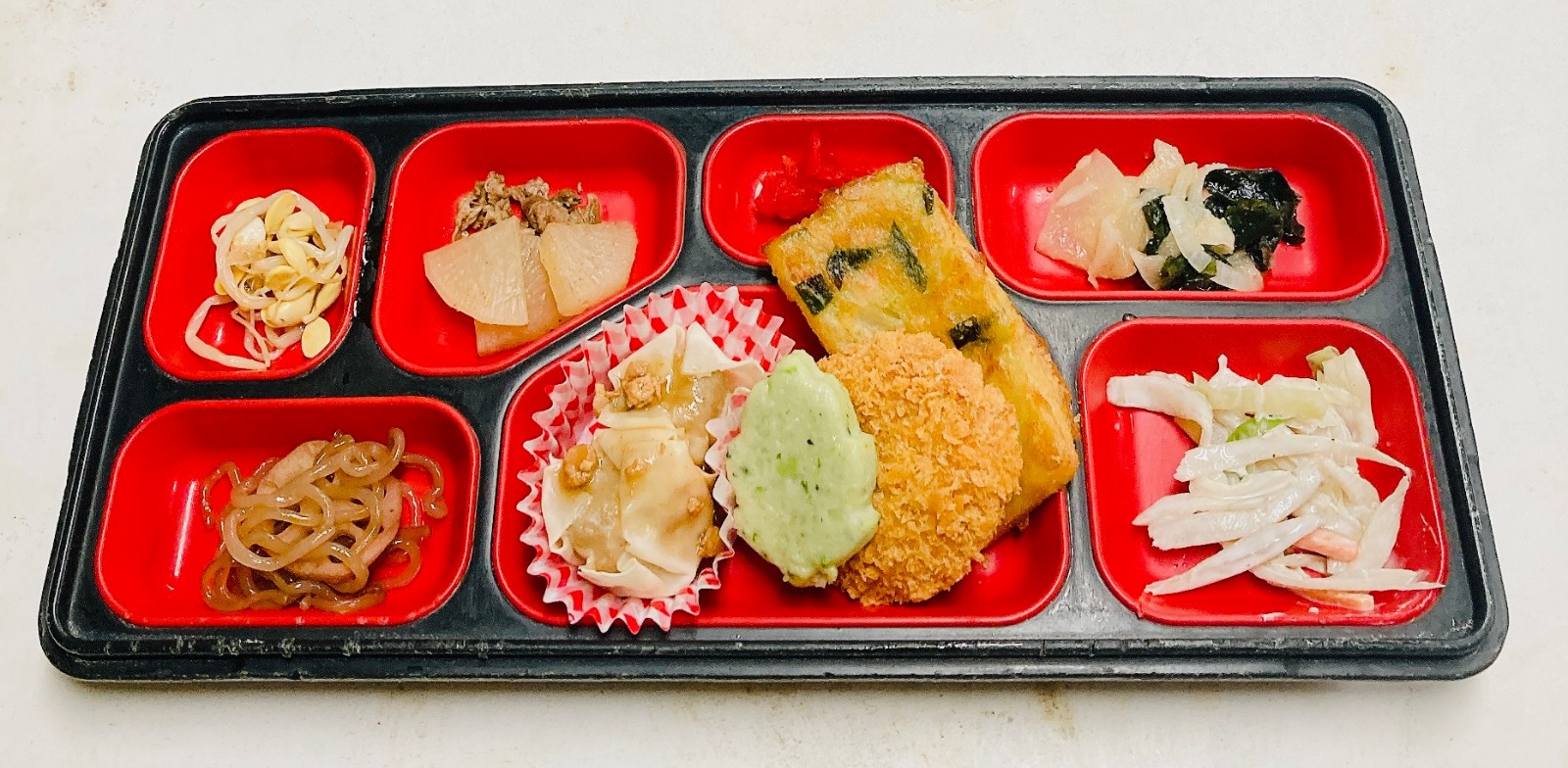 サラダうどん、白身魚天ぷら・さつま芋天ぷら・茄子天ぷら、南瓜煮、切干大根味噌煮、時雨煮