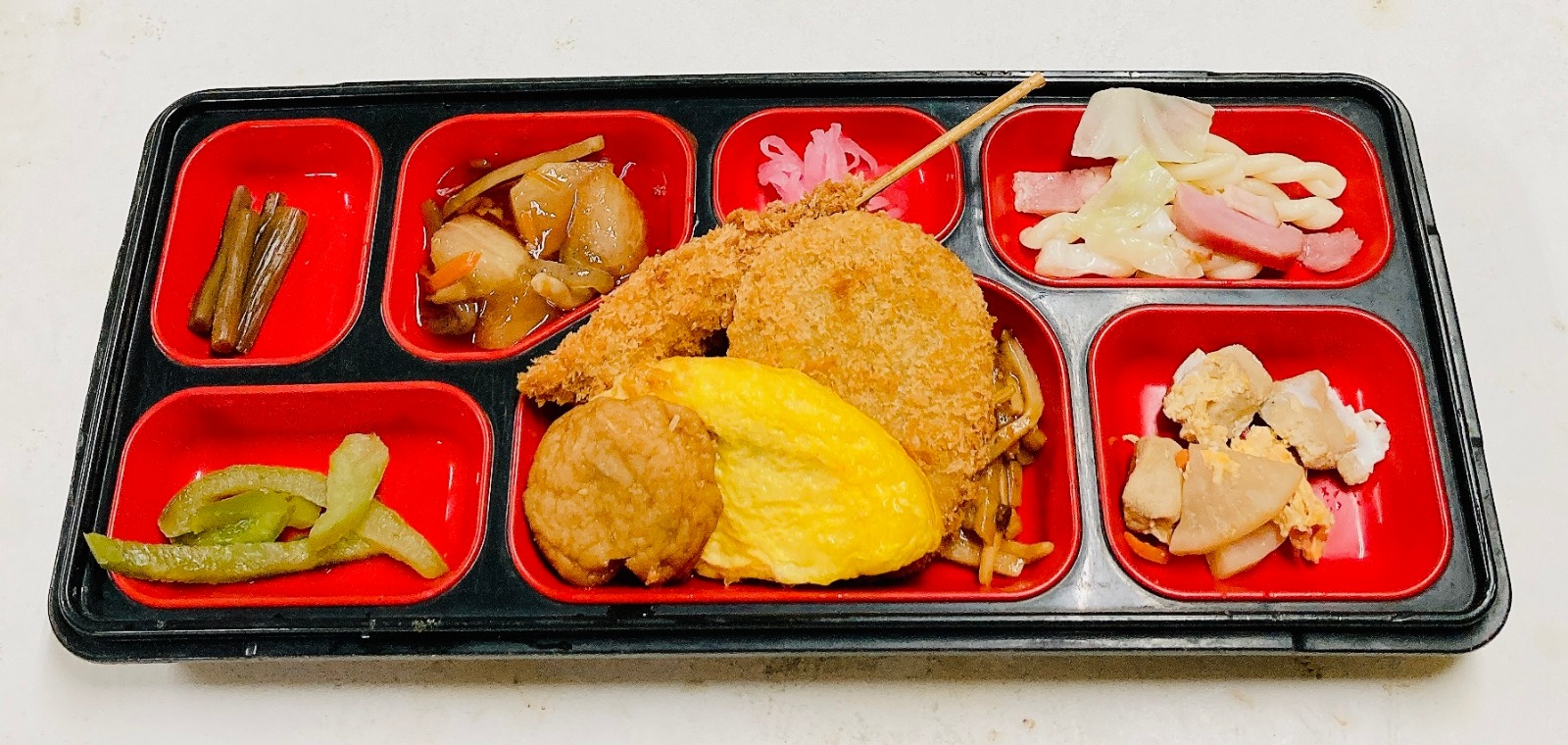 カレーコロッケ、豚ヒレ串カツ、ミートオムレツ、筍甘酢煮、マカロニベーコンソテー、大根高野豆腐卵とじ煮、ピーマンお浸し
