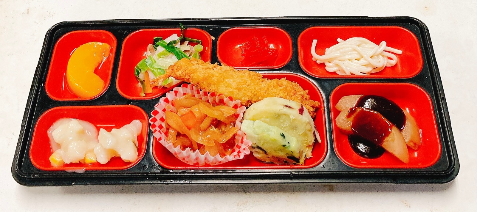 エビフライ、木の葉しんじょう、ふかし芋、甘酢煮、野菜炒め、味噌大根