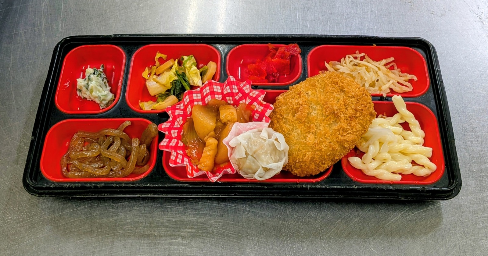 肉じゃがコロッケ、鶏信田巻き、ミートオムレツ、豚しゃぶサラダ、焼きそば、牛蒡胡麻和え、ひじき煮