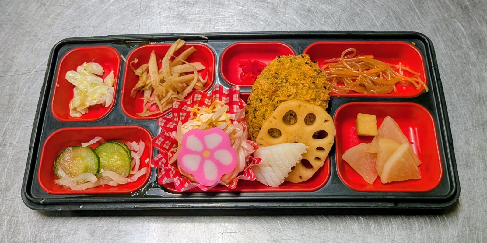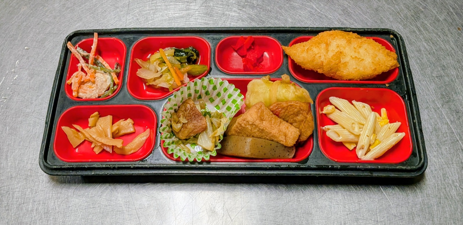 マヌルカンジャンチキン、煮卵、薩摩揚げ、金平牛蒡、韓国風サラダ、たらこスパゲティー、ピーマンお浸し