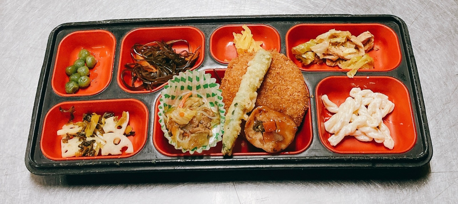 ソーセージカツ、インゲン天ぷら、八幡巻き、ガパオ炒め、糸切昆布煮、マカロニサラダ、春キャベツ煮物