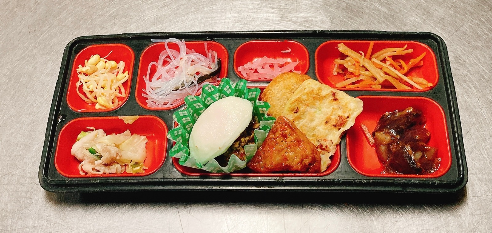 ガパオライス、目玉焼き風オムレツ、チーズポテトフライ、海鮮お好み焼き、三角薩摩揚げ、茄子トマト煮、金平牛蒡、春雨和え物