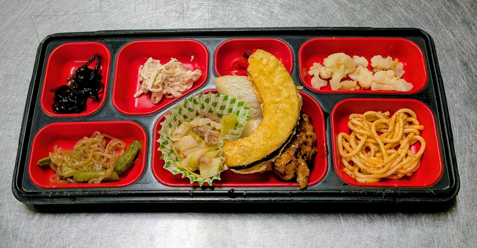 豚しゃぶ、鰈塩焼き、炭火焼き鶏つくね、南瓜天ぷら、トマトバジルスパゲティー、切干大根サラダ、カリフラワー和え物