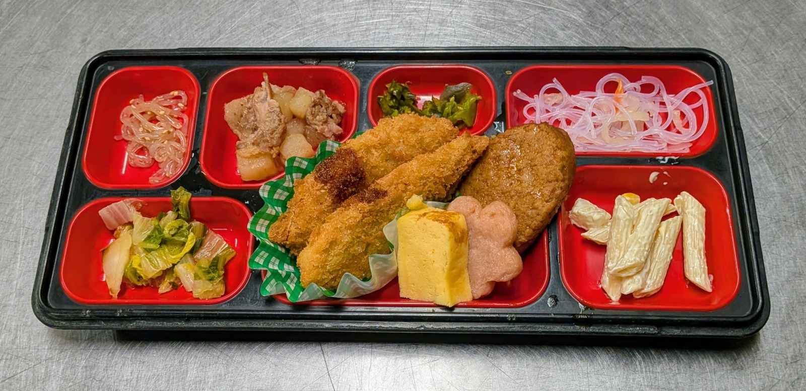 白身魚背脂ダレ、煮込みハンバーグ、厚焼玉子、花さつま、ペンネサラダ、肉じゃが、春雨酢の物