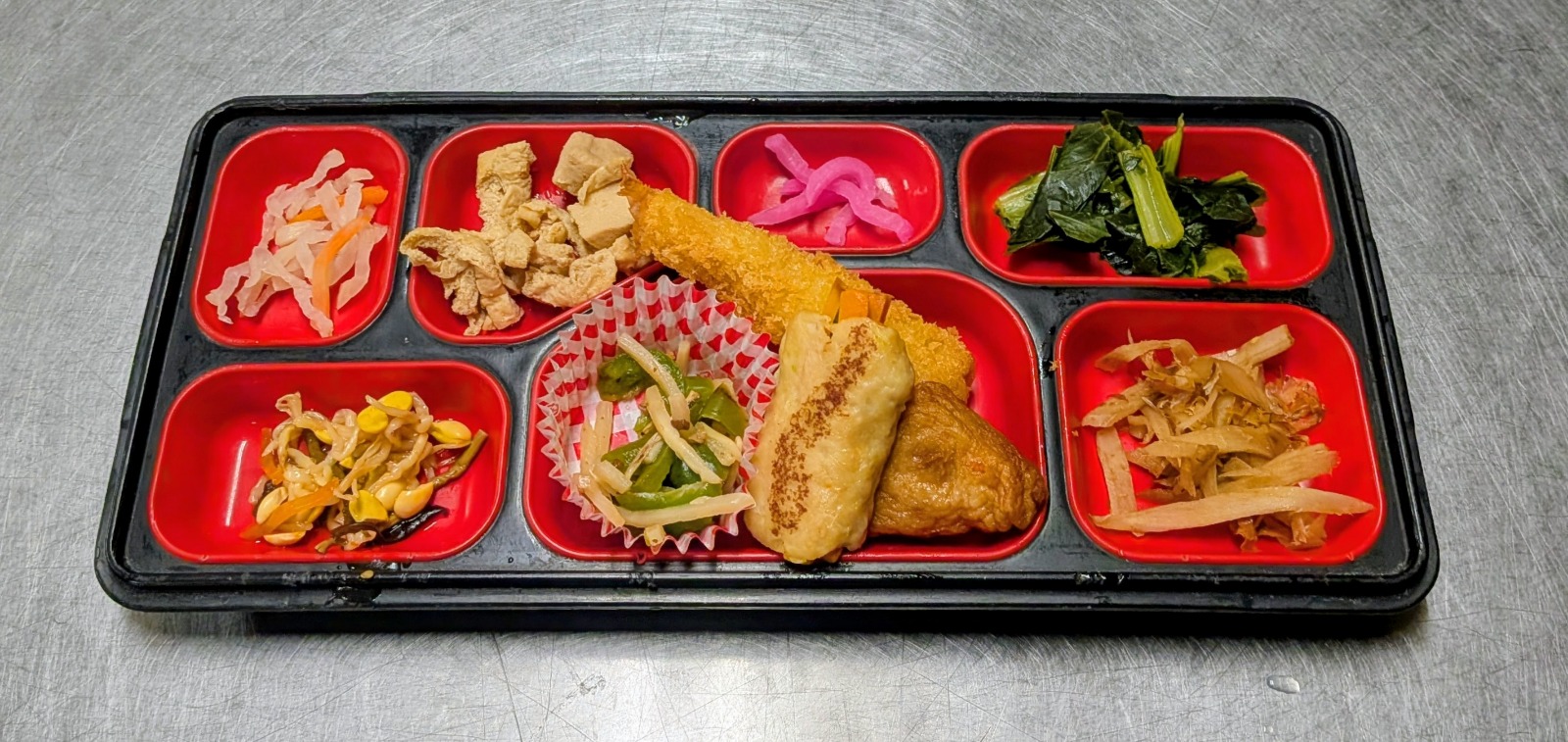 エビフライ、肉野菜巻き、△薩摩揚げ、竹の子味噌炒め、牛蒡かか煮、高野豆腐煮物、ビビンバ
