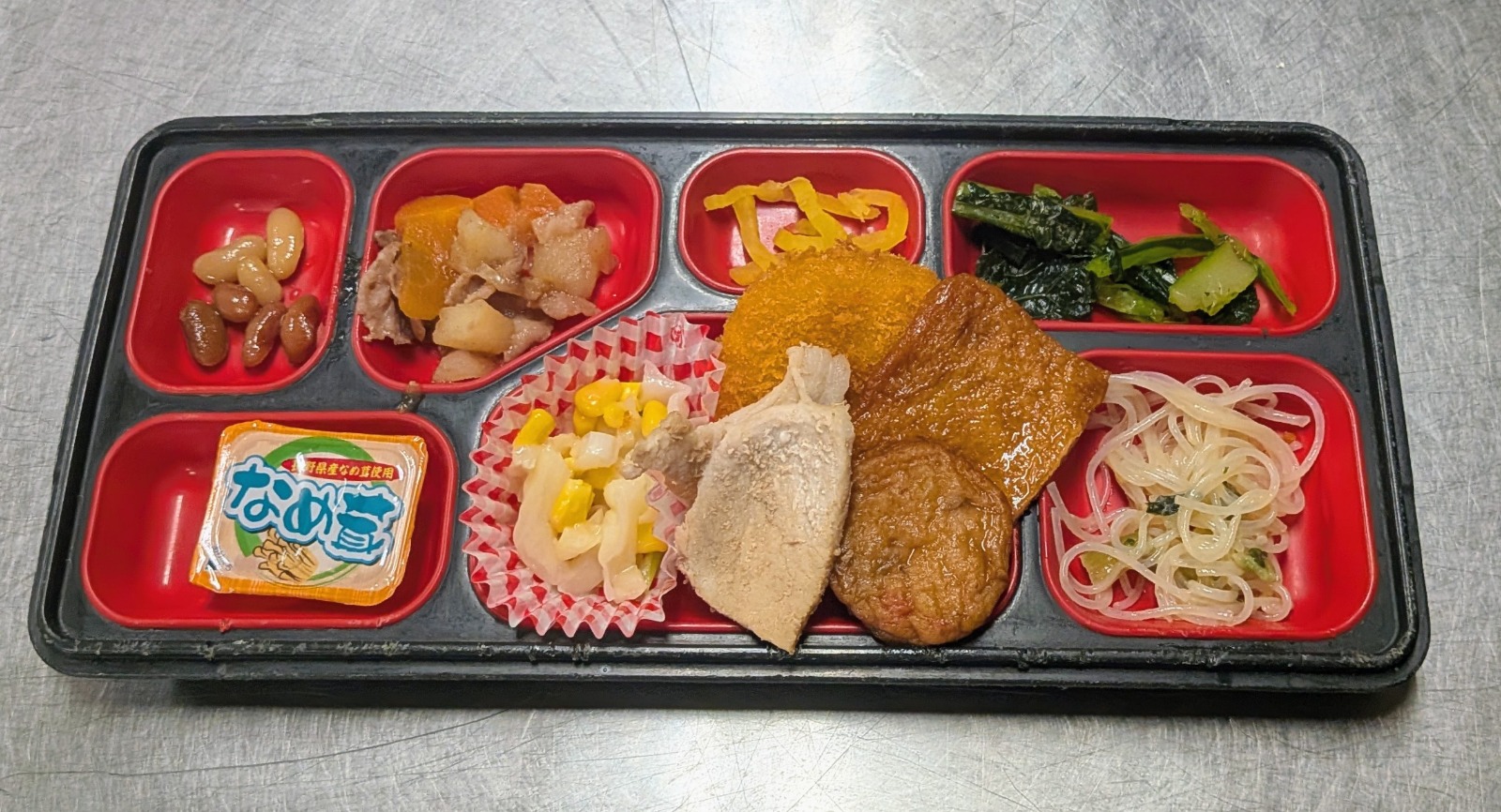 野菜コロッケ、茹で豚、牛蒡紅生姜揚げ半、キャベツとコーンサラダ、肉じゃが、春雨山葵和え、なめ茸