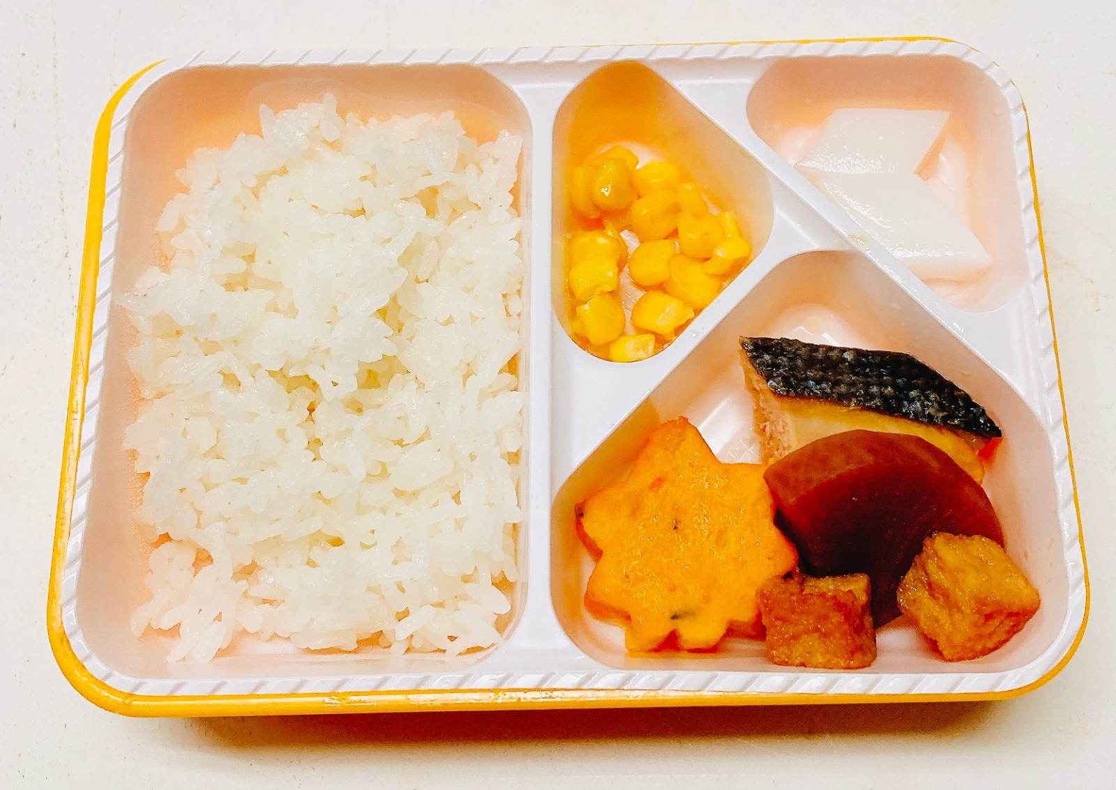 ・魚塩焼き・大根・厚揚げ・紅葉しんじょう・バターコーン・杏仁豆腐