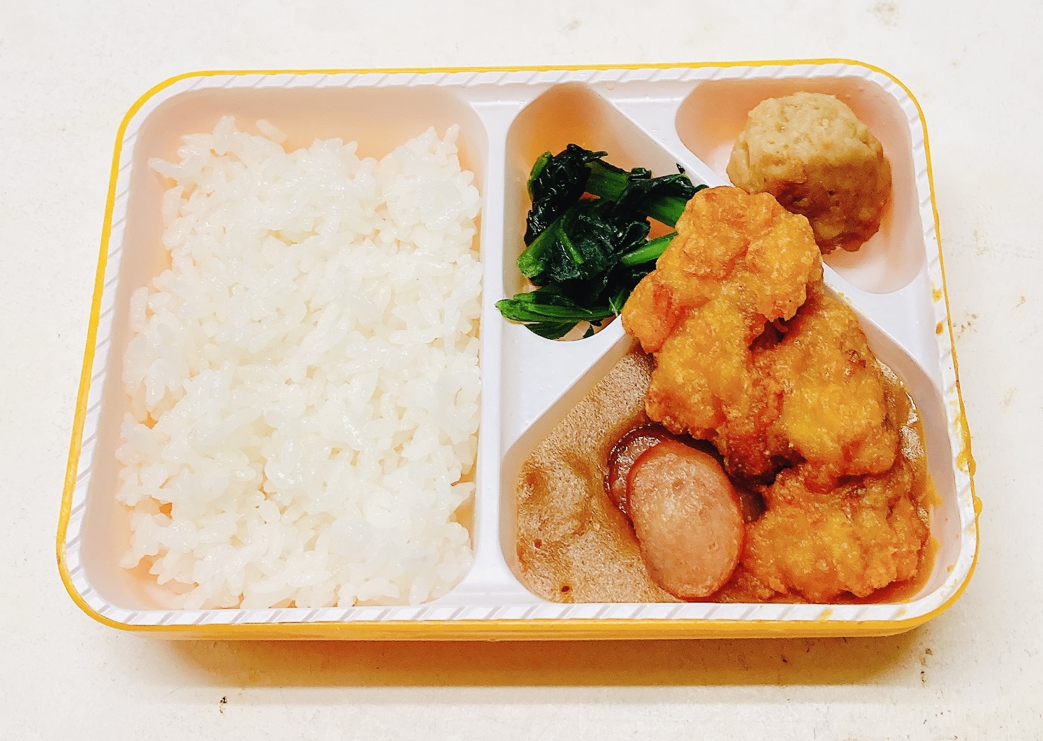 ・カレー・鶏唐揚げ・ウインナー・肉団子・青菜お浸し