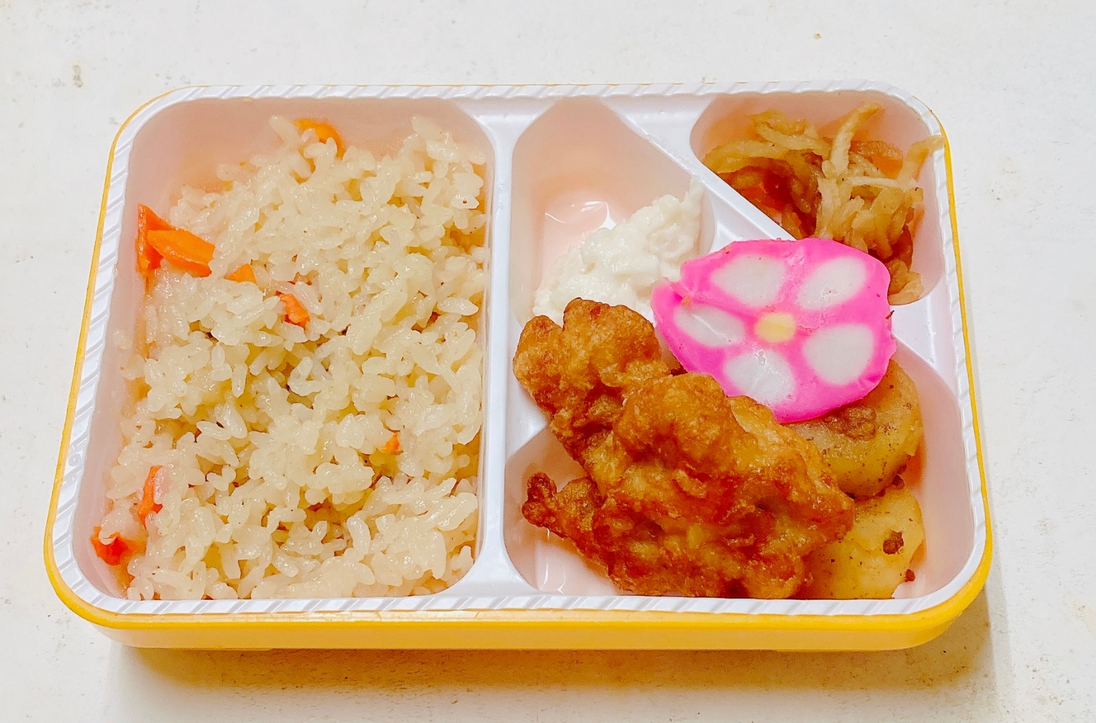 ・炊き込み御飯・鶏唐揚げ・肉じゃが・花かまぼこ・ポテトサラダ・切干大根煮
