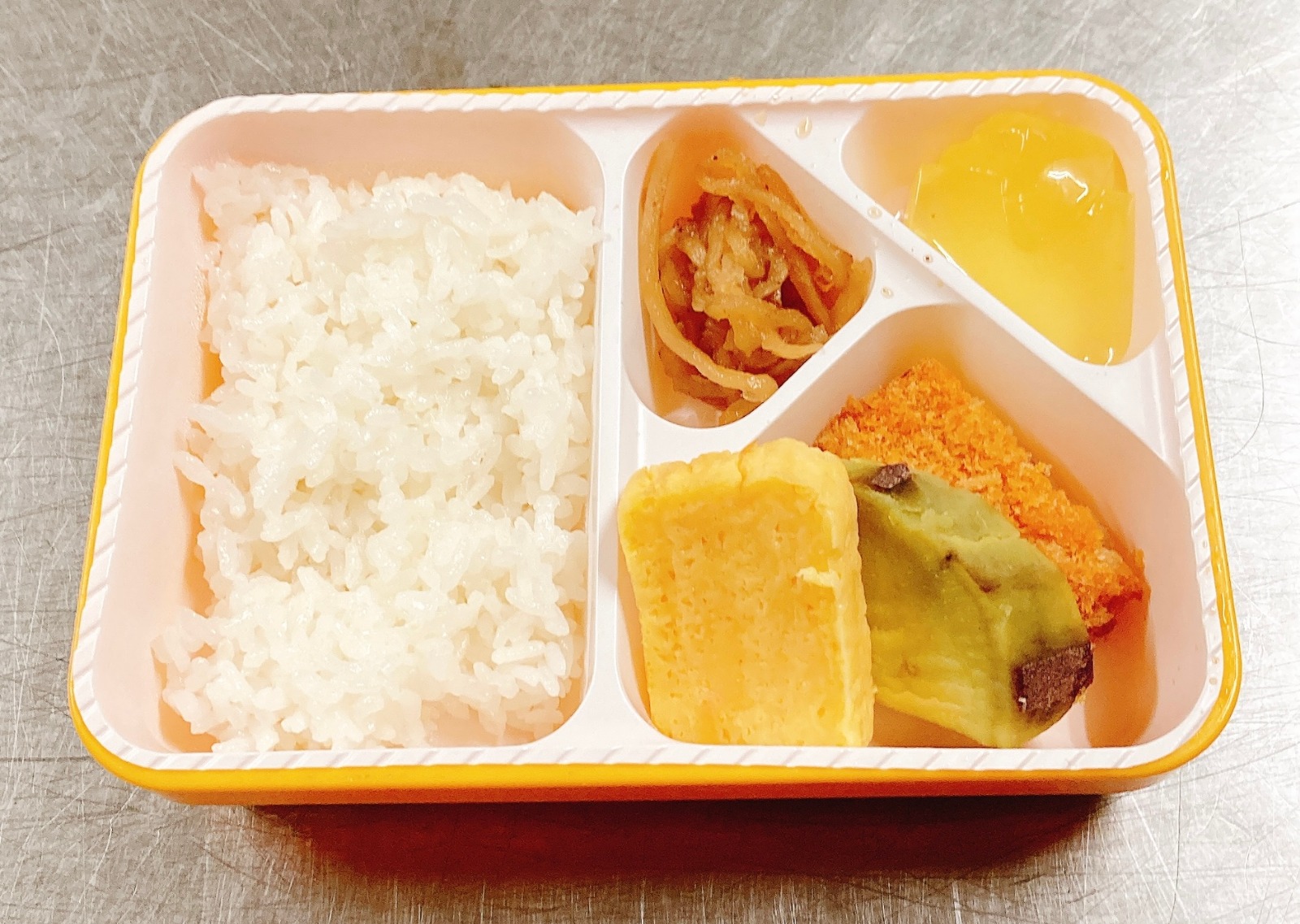 ・マグロメンチカツ・厚焼玉子・ふかし芋・切干大根煮・レモンゼリー